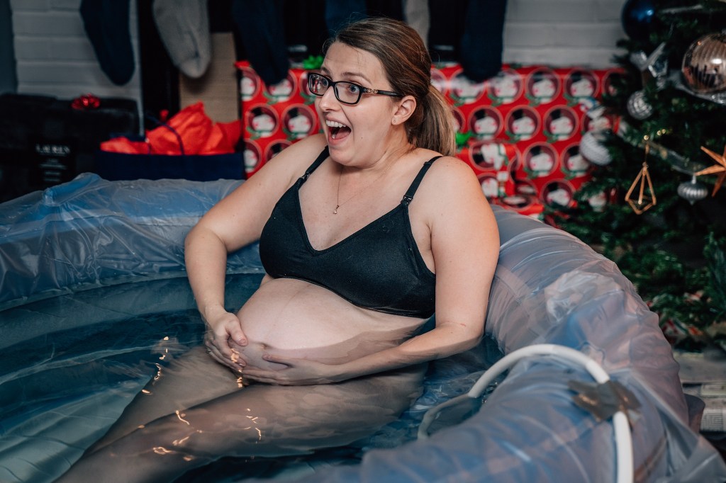 Around 8:30 pm, my team asked if I wanted to get into the pool. I shrugged and said, “Sure. I don’t feel like I need to, but why not?” We had such a great setup. The pool was in our living room, with lots of space for everyone to stretch out and Christmas lights twinkling nearby. I had envisioned catching my baby in that water and all of the natural birth magic that follows. If there’s one thing I’ve learned during this pregnancy though, it’s that this little guy will make his appearance on his own time and terms!