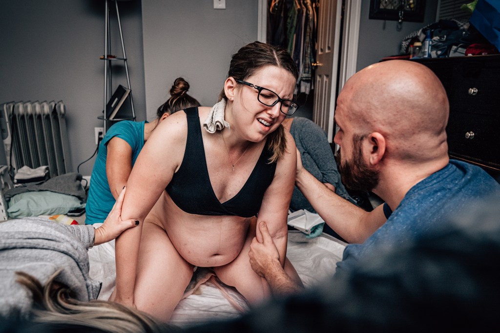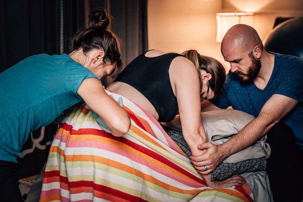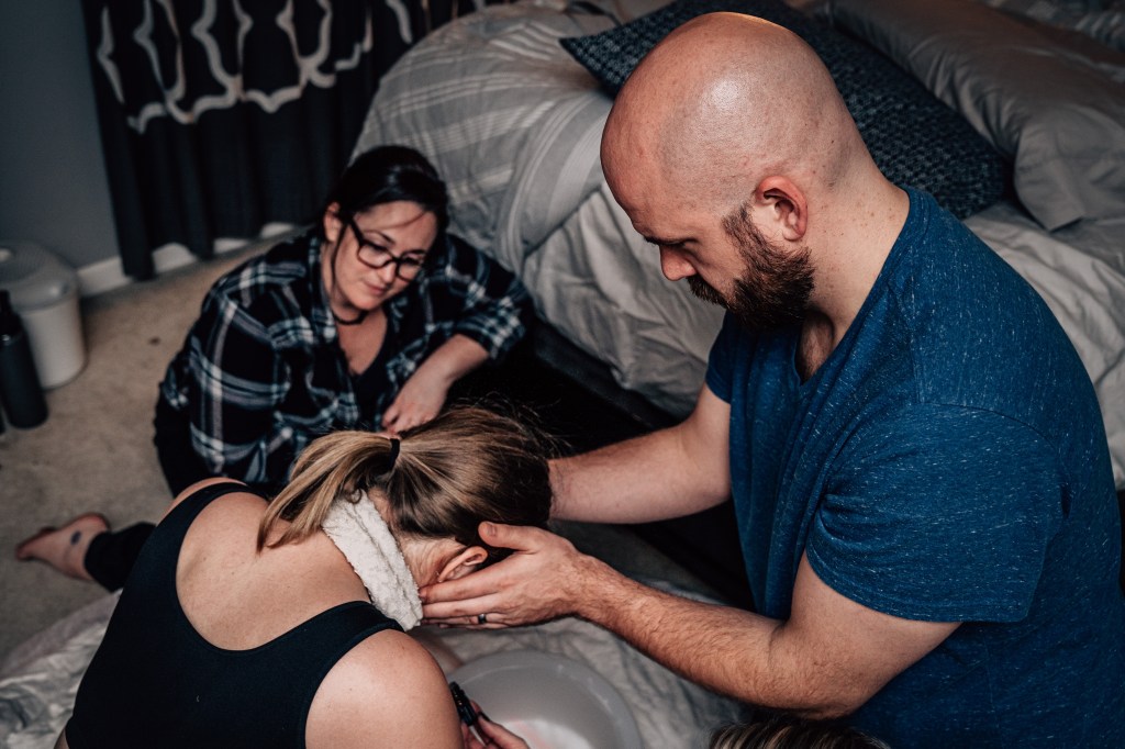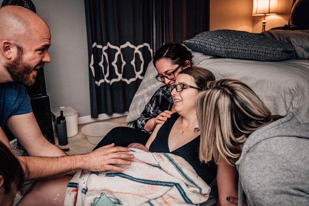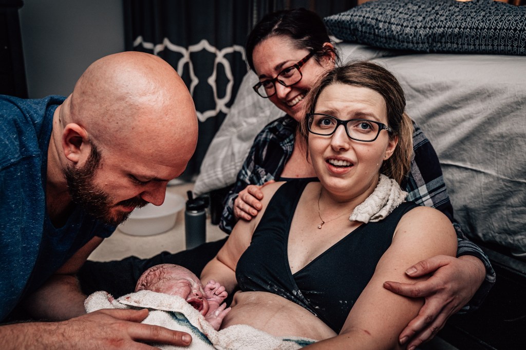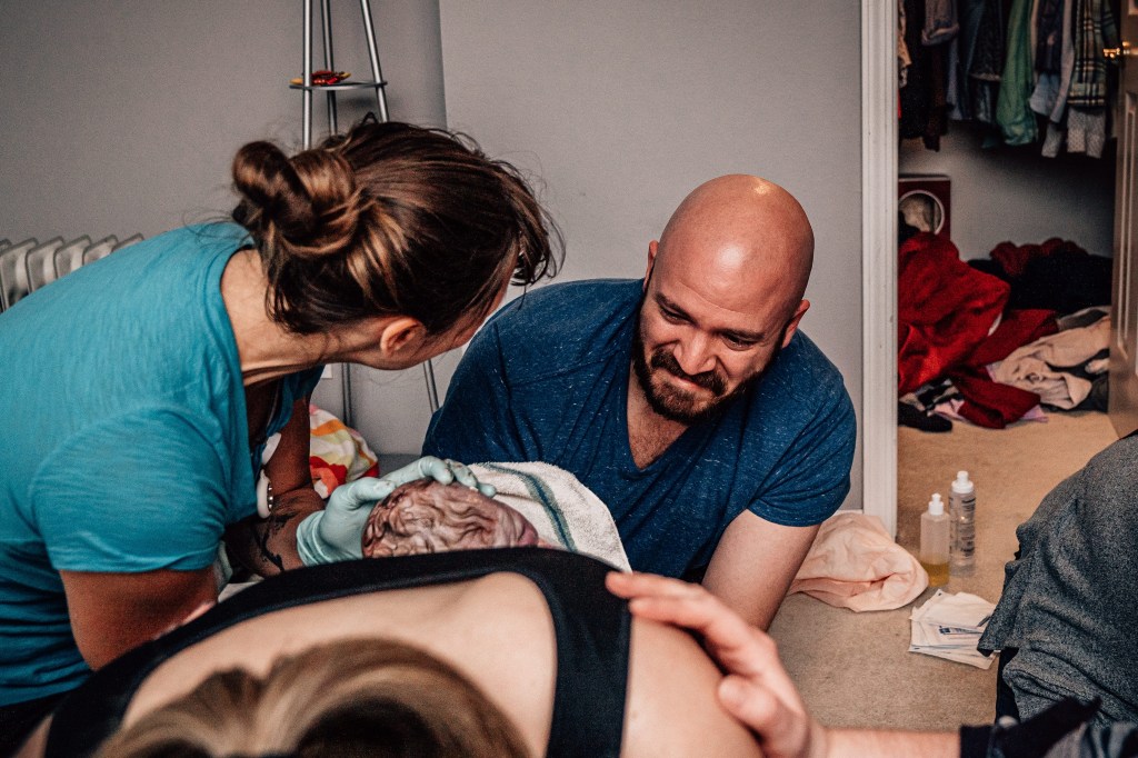 I had a couple of strong contractions that made it very clear to everyone that this baby was coming. I remember making it through a few contractions and spotting Julie, our assistant midwife, coming through our bedroom door with the entire birth kit in her arms. In my head, I thought, “Wait, no, I’m not having a baby in here. I’m going back down to the pool! I did not plan to have a baby on the floor of my messy bedroom!”