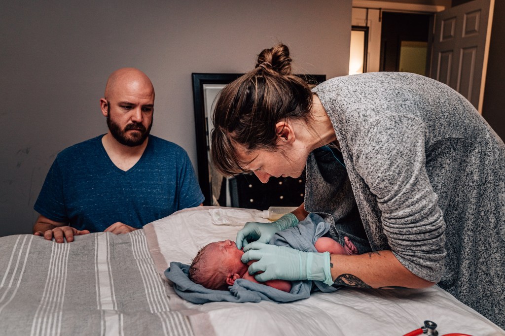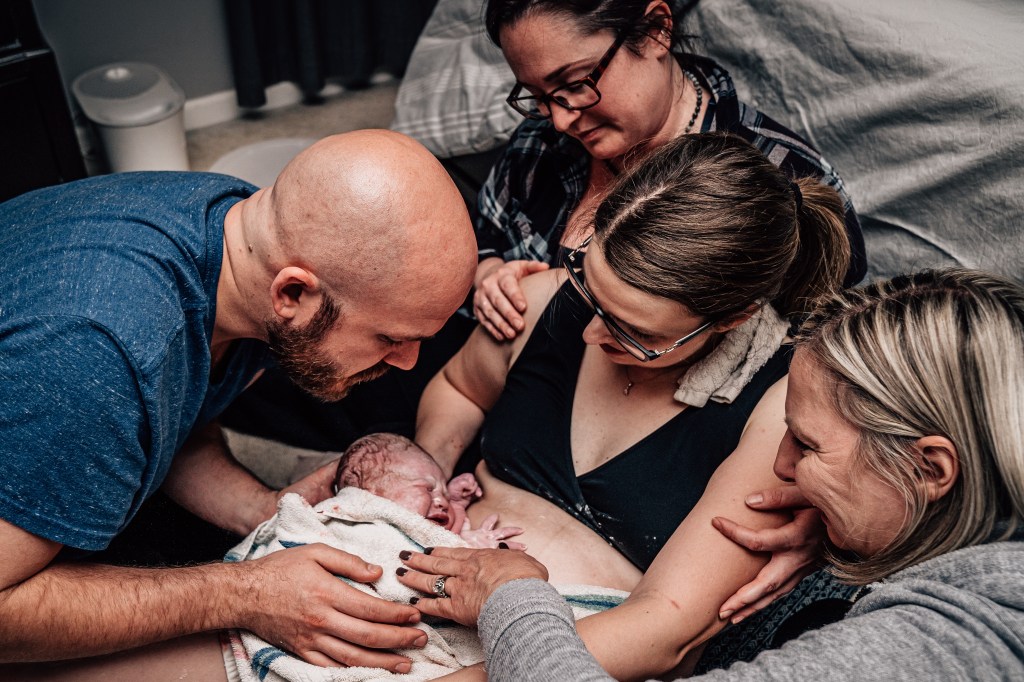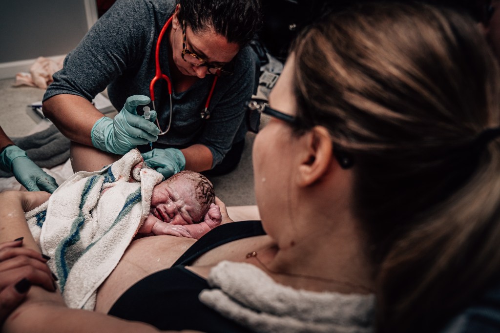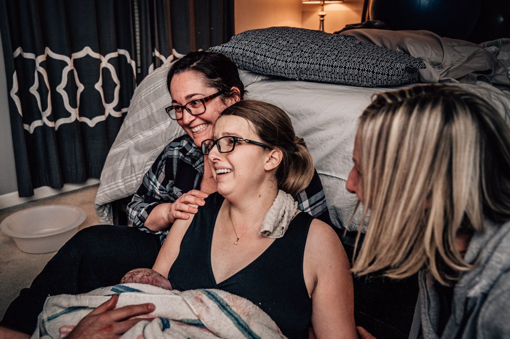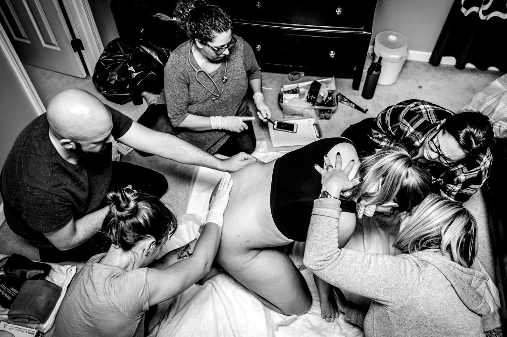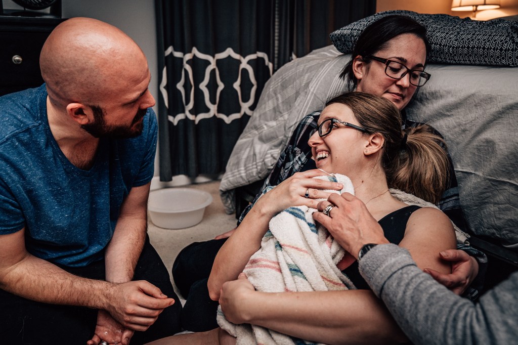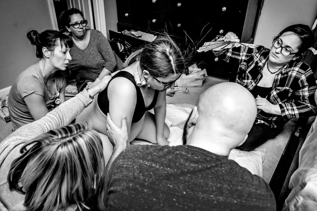 I had a couple of strong contractions that made it very clear to everyone that this baby was coming. I remember making it through a few contractions and spotting Julie, our assistant midwife, coming through our bedroom door with the entire birth kit in her arms. In my head, I thought, “Wait, no, I’m not having a baby in here. I’m going back down to the pool! I did not plan to have a baby on the floor of my messy bedroom!”