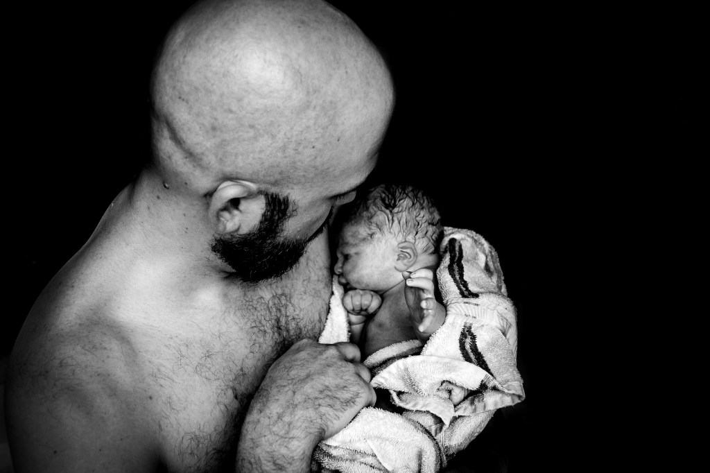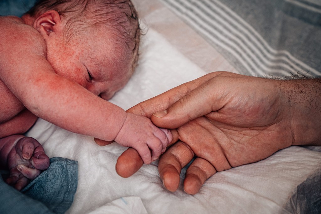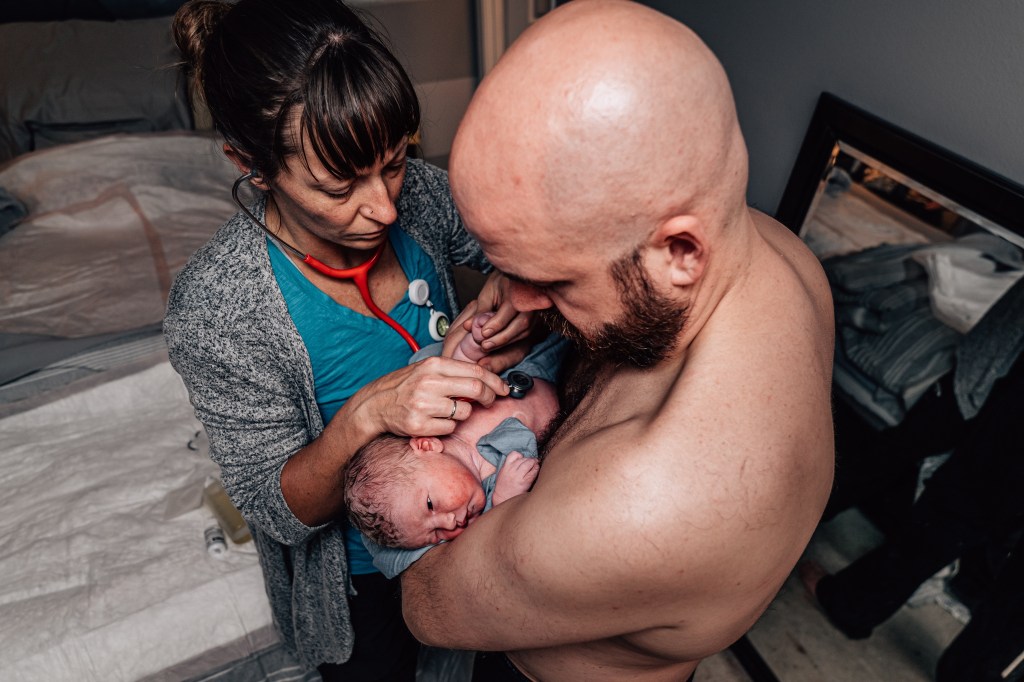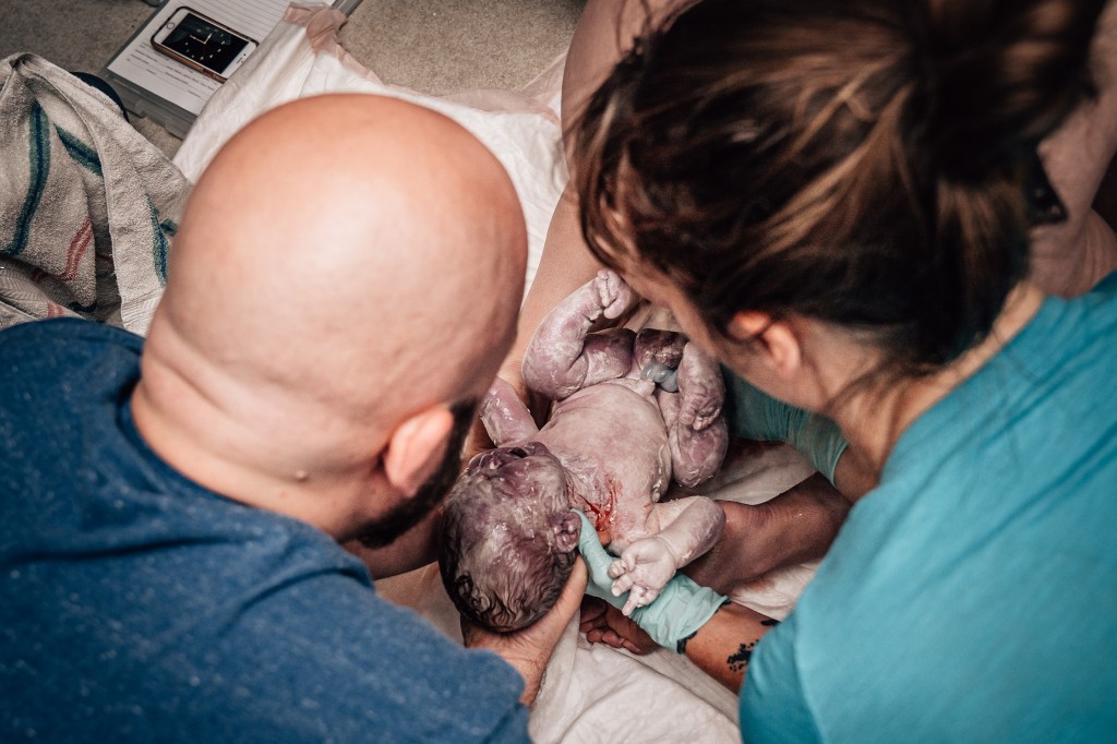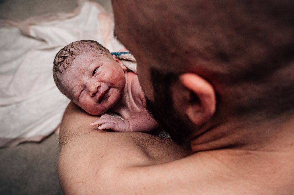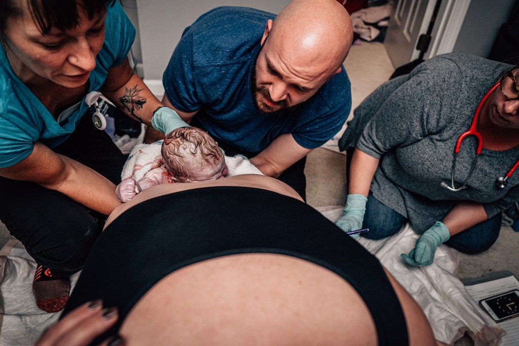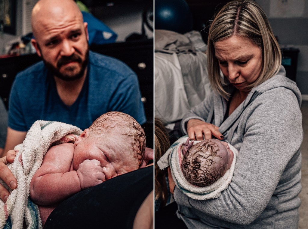 I pushed about five times and right as he was crowning, my water broke. Jen knew Smitty wanted to help catch him and she made that a priority. He came rushing into the world at 11:45 pm. I didn’t get to see Smitty’s face when it happened, so I’m incredibly grateful for these images that show the emotion that overtook everyone!